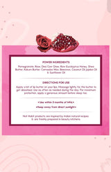 Kitchen fresh ultra moisturising Lip Butter made of Desi Ghee, Raw Honey and slow HEAT Infused pomegranate & rose. The Pomegranate Rose lip butter is packed with the goodness of fresh pomegranate, pomegranate peel, rose, desi ghee, eucalyptus honey, kokum butter, shea butter & pure cold pressed oils for express lip repair, moisturising nourishment, lip reddening and protection against aging, and darkening. ZERO chemicals & preservatives. ZERO mineral oil & paraffins.