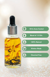 Pure Mukhalaya fresh blended with 13 oils. Mukhalaya stemming from 'mukha' & 'laya' signifies rhythm & harmony on face. This pristine facial oil, freshly blend from multiple oils, flowers, spices & herbs creates a therapeutic rhythm on the skin. Its crafted to treat oily skin condition & prevent acne with clove, marigold, tea tree, seabuckthorn, rosemary, geranium, marula, pumpkin seed, pomegranate seed, flaxseed, lemongrass, jojoba & multiple more oils.